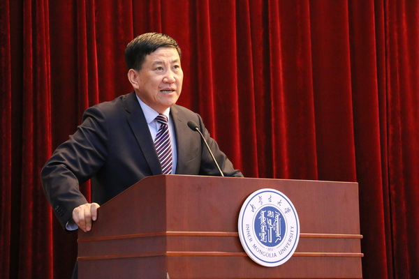 我校副校长额尔很巴雅尔教授作讲话。首先,祝贺2018级新同学经过十几年的艰苦学习,考入了梦寐以求的内蒙古大学,并对全体新生为学校注入更加新鲜的血液表示忠心的感谢。接着,简单介绍了学校及学院的发展概况。他说,早在1957年在内蒙古自治区成立十周年之际,内蒙古大学高起点创办,国家教育部从北京大学、南开大学等国内著名学府,选派一批知名学者和学科带头人到内蒙古大学工作,为学校后续发展奠定了坚实的基础和优良学风校风。建校61年来,内蒙古大学全面贯彻党的教育方针,在几十年的发展中,遵循 “双重任务”办学基本方针,弘扬“崇尚真知、追求卓越”的内大精神,经过 “211工程”、“省部共建”、“一省一校”、 国家一流学科建设高校等项目的建设和支持,实现了几次重大跨越,今天已成为教育部和内蒙古自治区合建高校。蒙古学是我校重点发展学科、也是特色优势学科,蒙古学学院是全区、全国乃至全世界蒙古学研究的中心,经过几代人的辛勤耕耘发展成为现在的规模,多年来不仅培养出了很多著名学者,推动了我国乃至全世界的蒙古学研究,对社会经济发展做出重大贡献,同学们选择蒙古学学院是幸运的,也是幸福的。