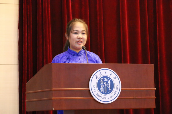蒙古语言文学系2018级文理综合班乌日力嘎同学代表新生发言。她表示,很自豪成为内蒙古大学的一员,在以后的四年里会加倍珍惜来之不易的大学生活和内蒙古大学为她们提供的优厚的教学资源及学习环境,进一步明确目标,勤奋学习、锻炼身体,成为德智体美劳全面发展的社会有用人才。