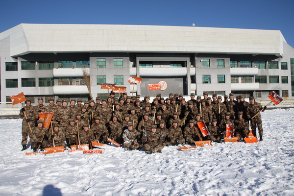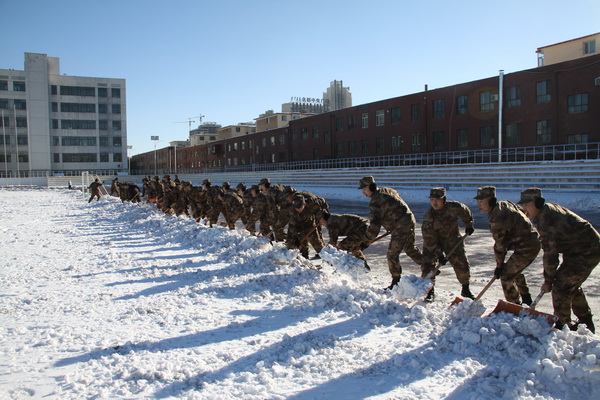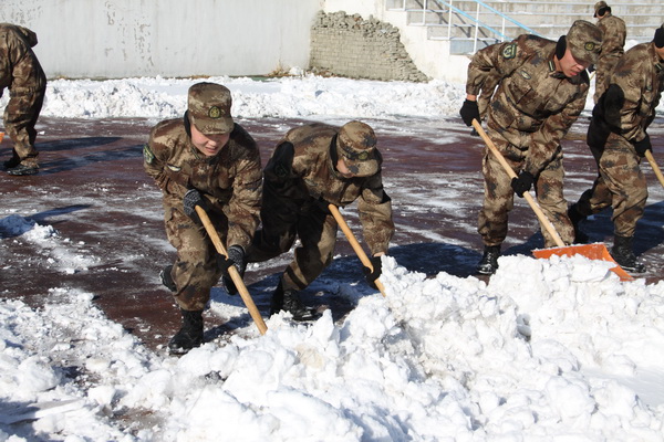 当日,在学校学工处的大力协调下,在驻校选培办的严密组织下,“国防绿”洒遍了校园综合训练场。恶劣的天气丝毫没有影响大家的热情和工作效率,我校国防生吃苦耐劳、顽强拼搏的战斗精神也在这一刻得到了充分展现。通过大家的努力,短短一个小时内已将训练场积雪清扫干净。